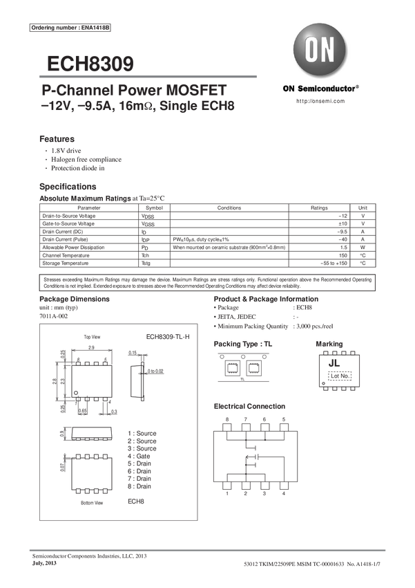 ECH8309 P-Channel Power MOSFET -12V, -9.5A, 16mΩ