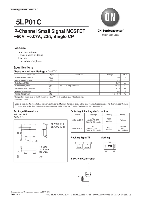 5LP01C Small Signal MOSFET -50, -0.07A 23 Ohm Single P-Channel CP