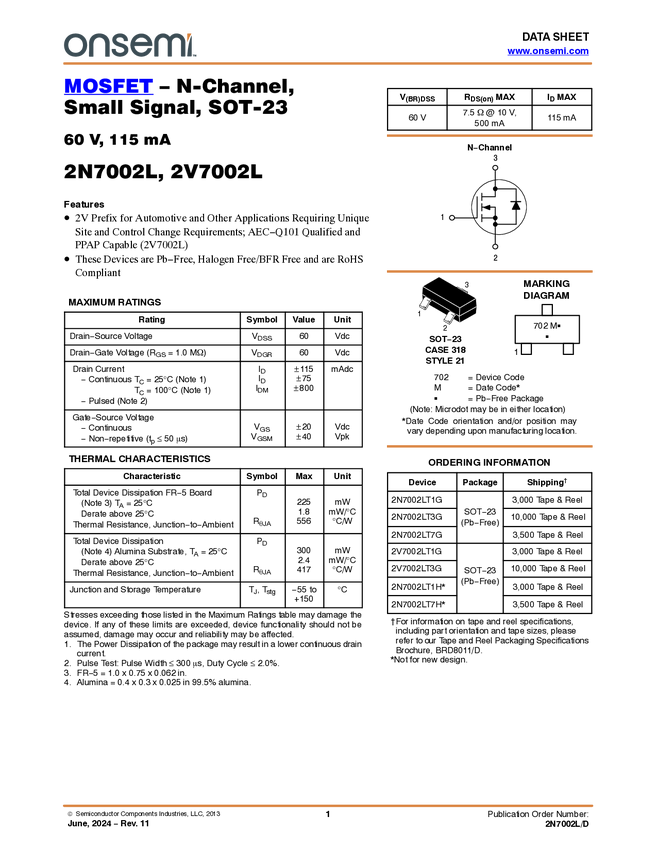 N-Channel Small Signal MOSFET 60V, 115mA, 7.5Ω