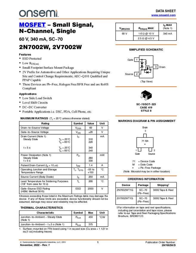 2N7002WT1G N-Channel Small Signal MOSFET 60V, 340mA, 1.6Ω
