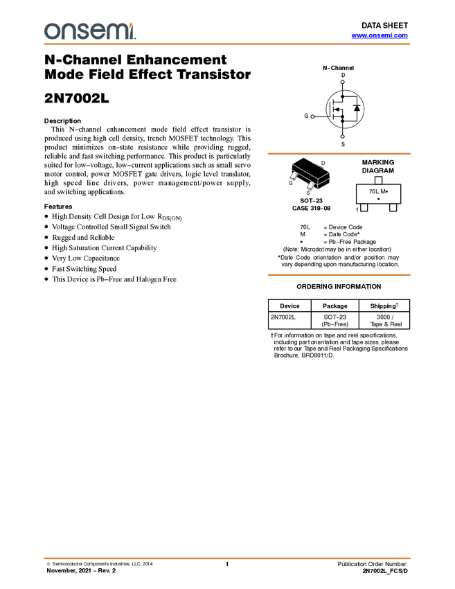 2N7002L N-Channel Small Signal MOSFET 60V 115mA 7.5 Ω
