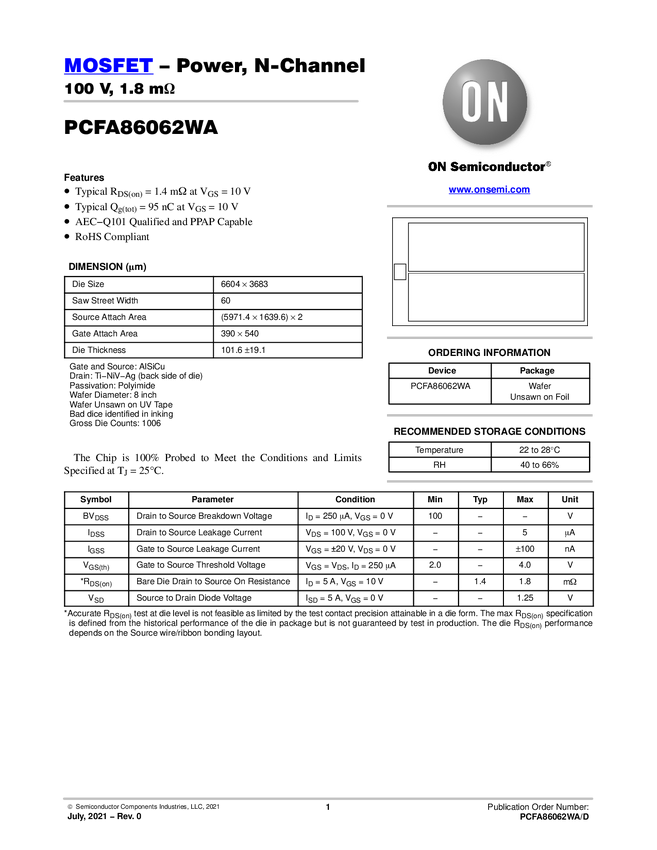 PCFA86062WA Power MOSFET, N-Channel, 100 V, 1.8 mΩ, Bare Die