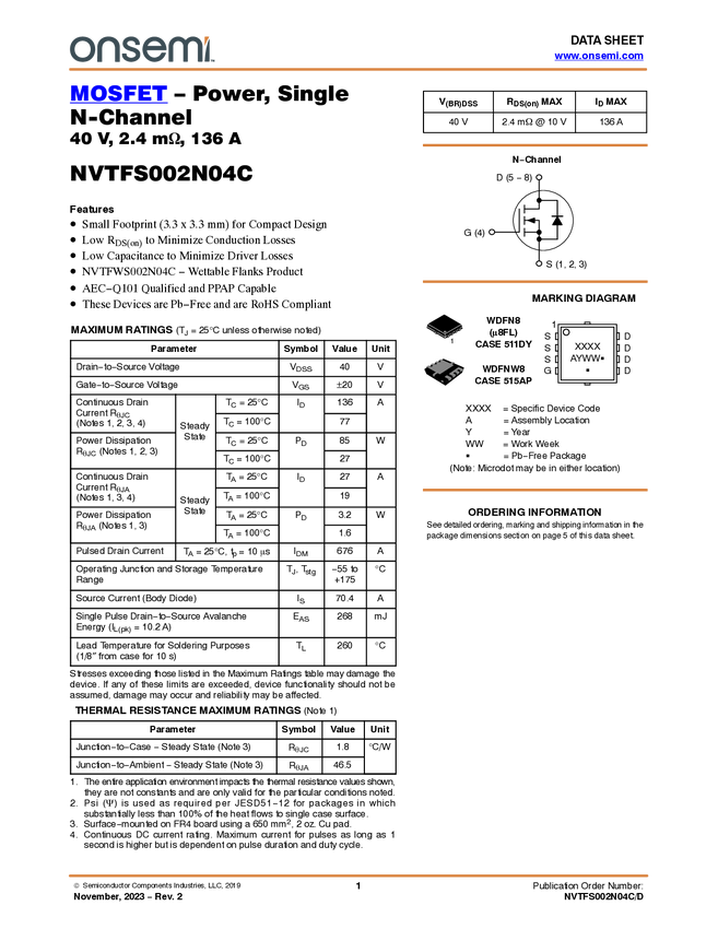 NVTFWS002N04C Power MOSFET, 40 V, 2.4 Ω, 136 A, Single N-Channel