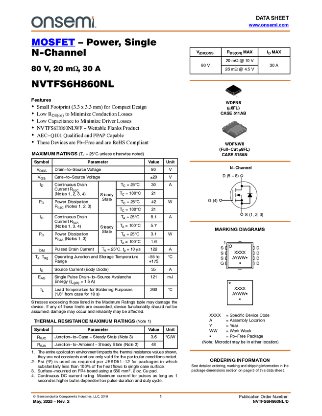 NVTFS6H860NL MOSFET - Power, Single N-Channel, 80 V, 20 mΩ 30 A - NVTFS6H860NL