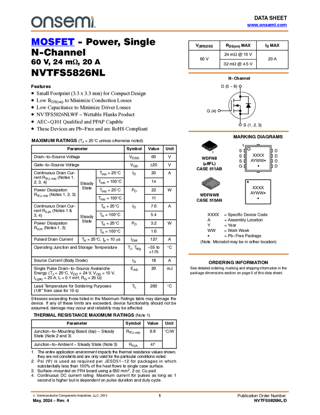 NVTFS5826NL Power MOSFET 60V, 20A, 24 mOhm, Single N-Channel, u8FL, Logic Level.