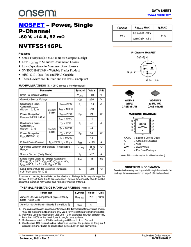 NVTFS5116PL Single P-Channel Power MOSFET -60V, -14A, 52mΩ