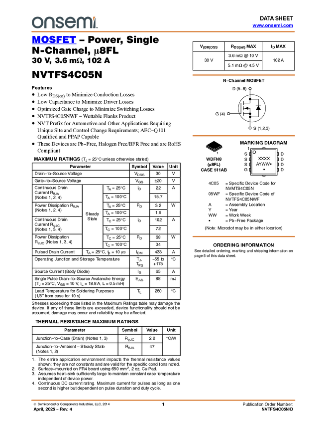 NVTFS4C05N Single N-Channel Power MOSFET 30V, 102A, 3.6mΩ