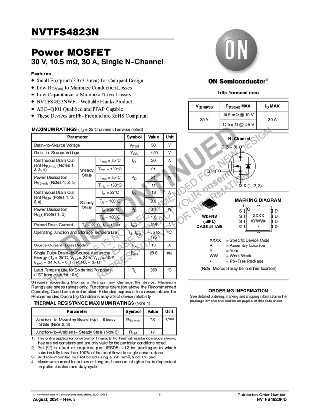 NVTFS4823N Power MOSFET 30V, 30A, 10.5 mOhm, Single N-Channel, u8FL, Logic Level.