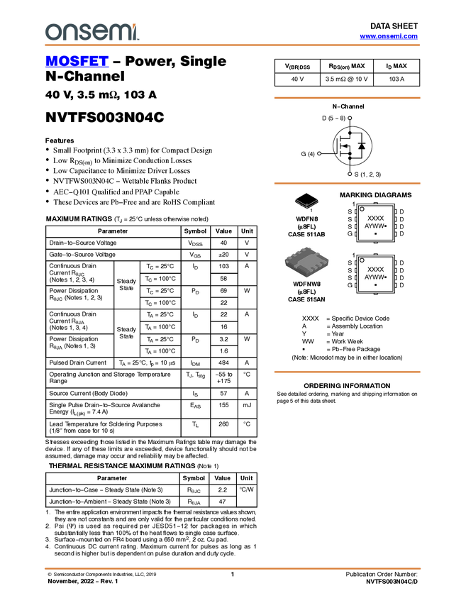 NVTFS003N04C Single N-Channel Power MOSFET 40V, 103A, 3.5mΩ