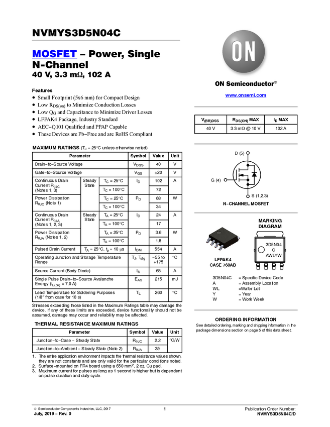 NVMYS3D5N04C Power MOSFET 40 V, 3.3Ω, 102 A, Single N-Channel