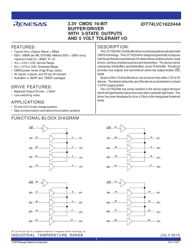 74LVC162244APAG 3.3V CMOS 16-Bit Buffer/Driver with 3-State Outputs, 5.0V Tolerant I/O, and...