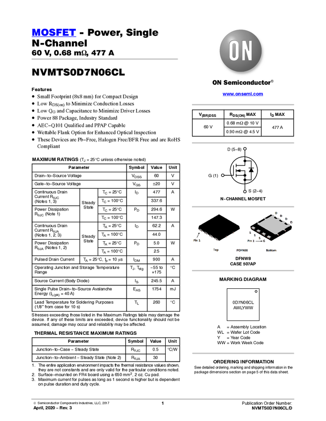 NVMTS0D7N06CL Single N-Channel Power MOSFET 60V, 447A, 0.68mΩ
