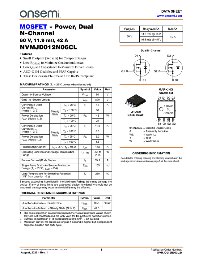 NVMJD012N06CL Dual N−Channel Power MOSFET 60V, 42A, 11.9mΩ