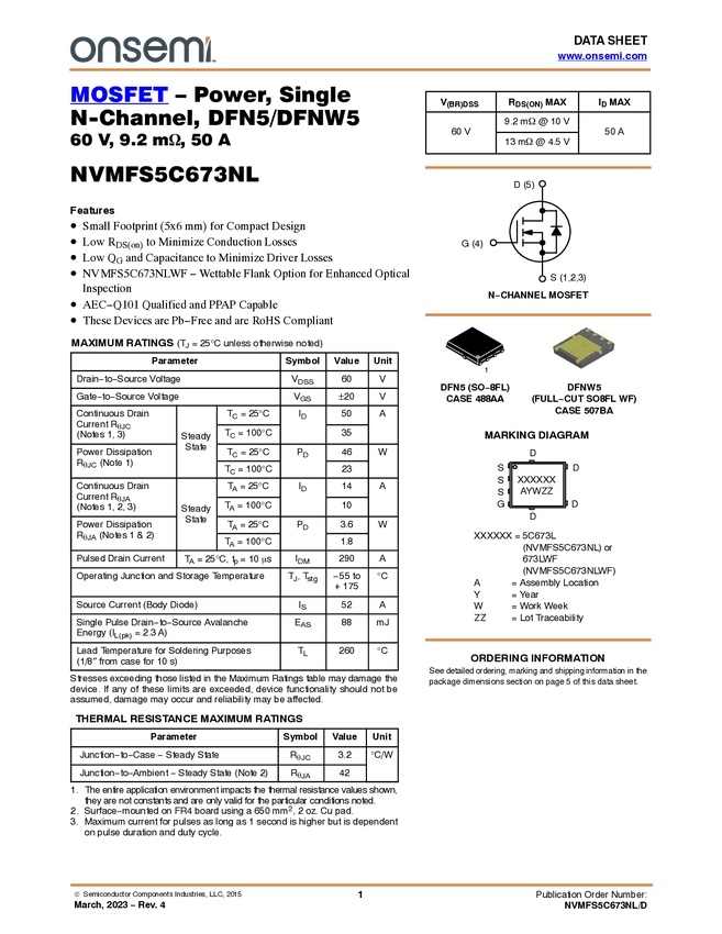 NVMFS5C673NL Single N-Channel Power MOSFET 60V, 50A, 9.2mΩ