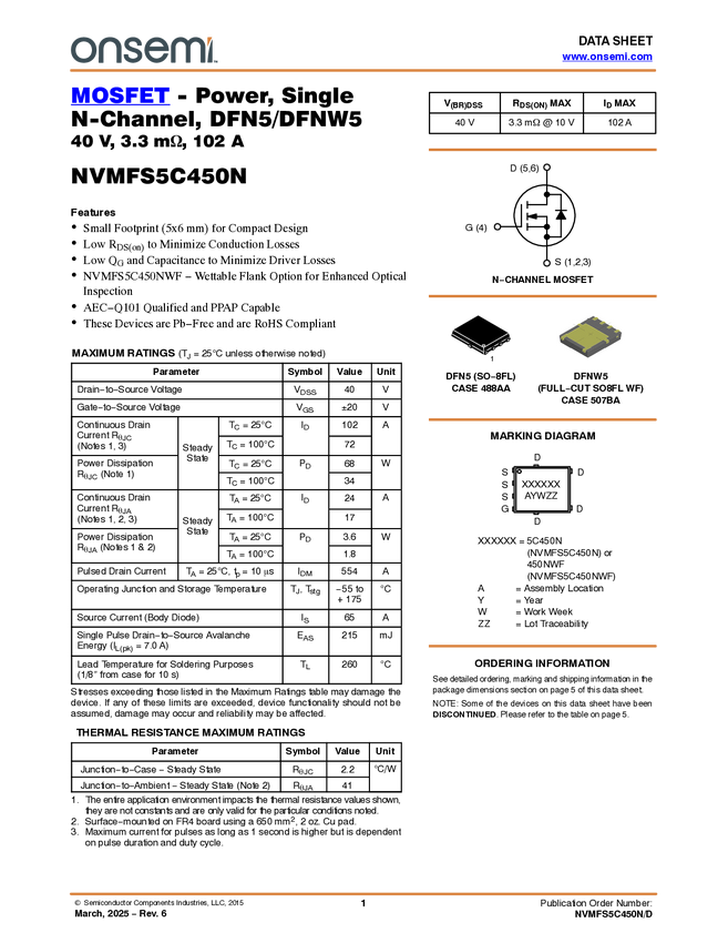 NVMFS5C450N Single N-Channel Power MOSFET 40V, 102A, 3.3mΩ
