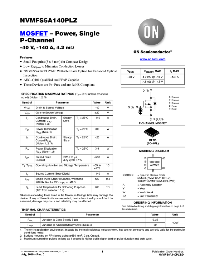 NVMFS5A140PLZ Single P-Channel Power MOSFET, -40 V, -140 A, 4.2 mΩ