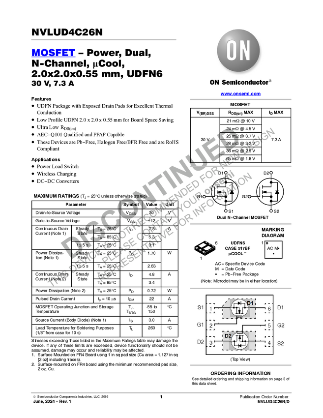 NVLUD4C26N Dual N-Channel Power MOSFET 30V, 8.7A, 21mΩ