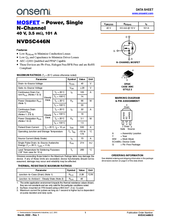 NVD5C446N Single N-Channel Power MOSFET 40V, 101A, 3.5mΩ