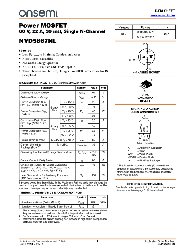 NVD5867NL Single N-Channel Power MOSFET 60V, 22A, 39mΩ