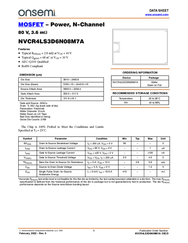 NVCR4LS3D6N08M7A Power MOSFET, N-Channel, 80 V, 3.6 mΩ, Bare Die