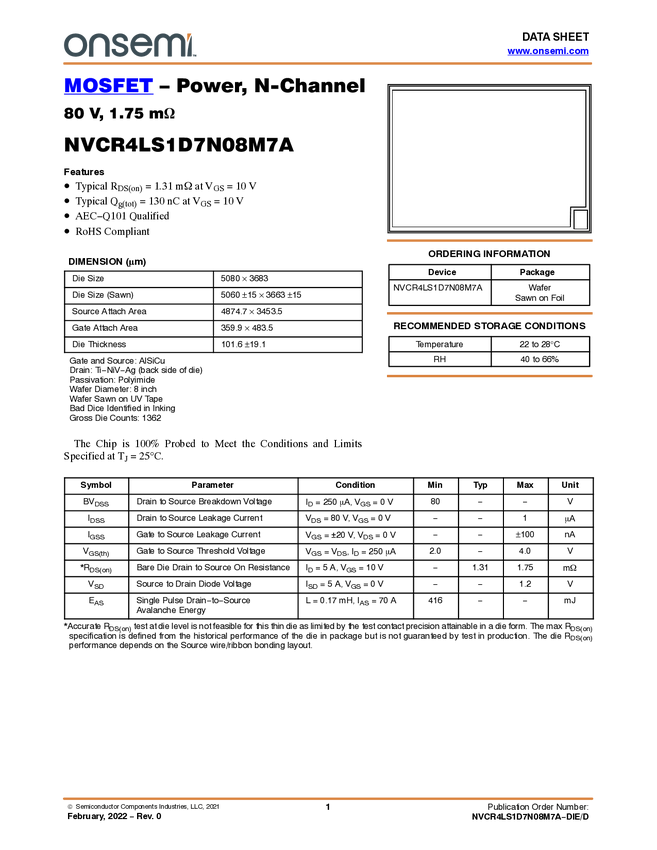 NVCR4LS1D7N08M7A Power MOSFET, N-Channel, 80 V, 1.75 mΩ, Bare Die