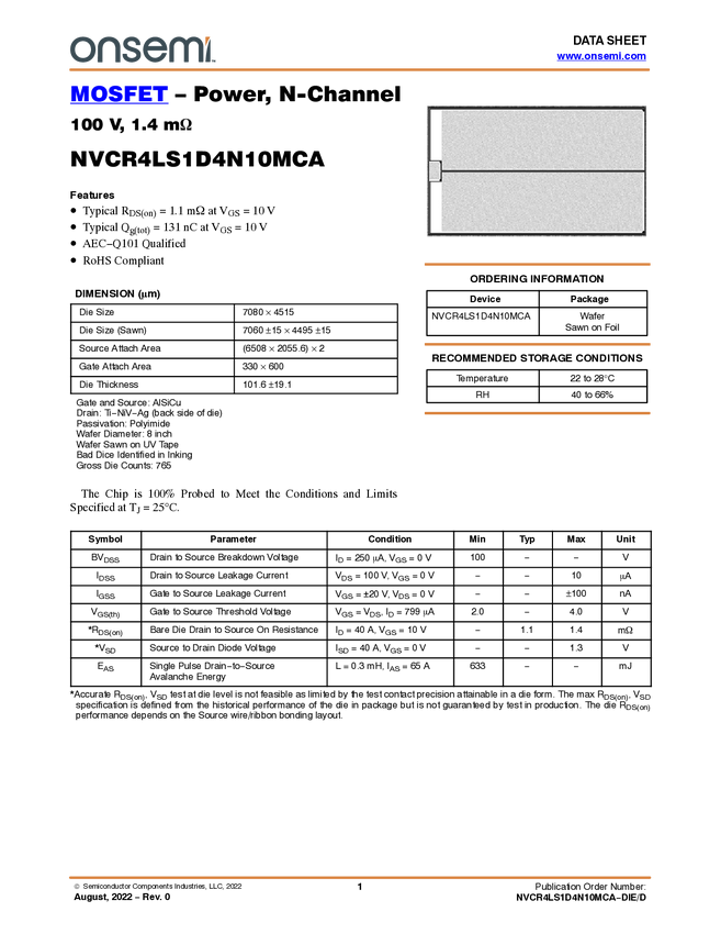 NVCR4LS1D4N10MCA Power MOSFET, N-Channel, 100 V, 1.4 mΩ, Bare Die