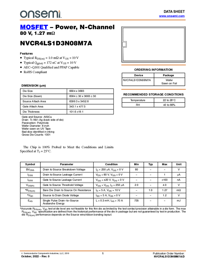 NVCR4LS1D3N08M7A Power MOSFET, N-Channel, 80 V, 1.27 mΩ, Bare Die