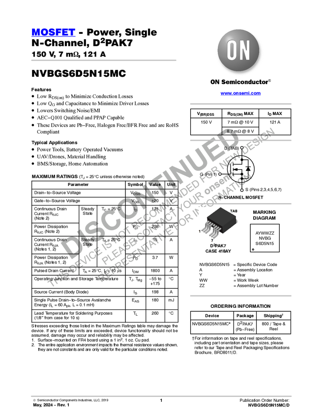MOSFET - Power, Single N-Channel, D2PAK7 150 V, 7 mΩ, 121 A