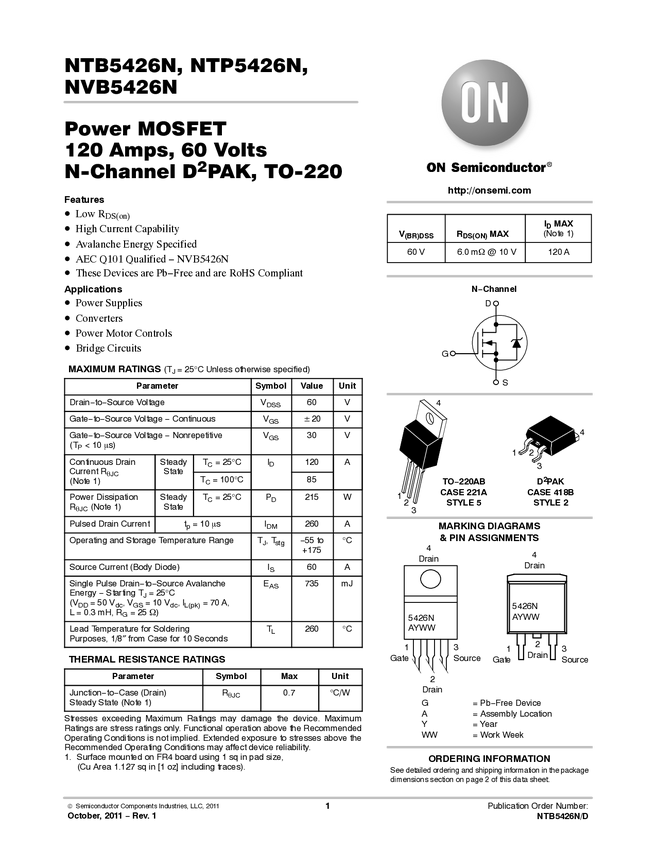 NVB5426N Power MOSFET 60V 120A 6 mOhm Single N-Channel D2PAK