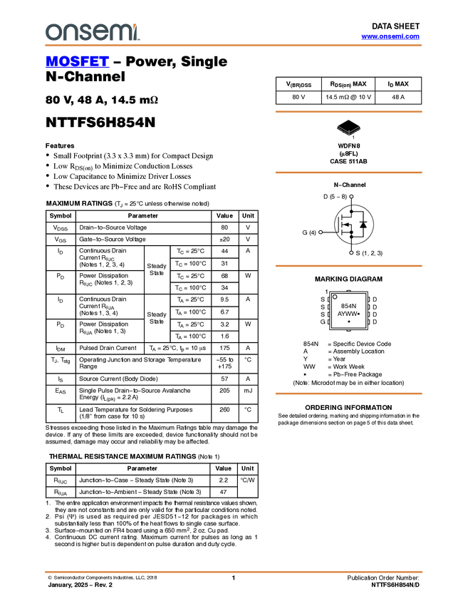 NTTFS6H854N Power MOSFET, Single N-Channel, 80V, 48A, 14.5mΩ