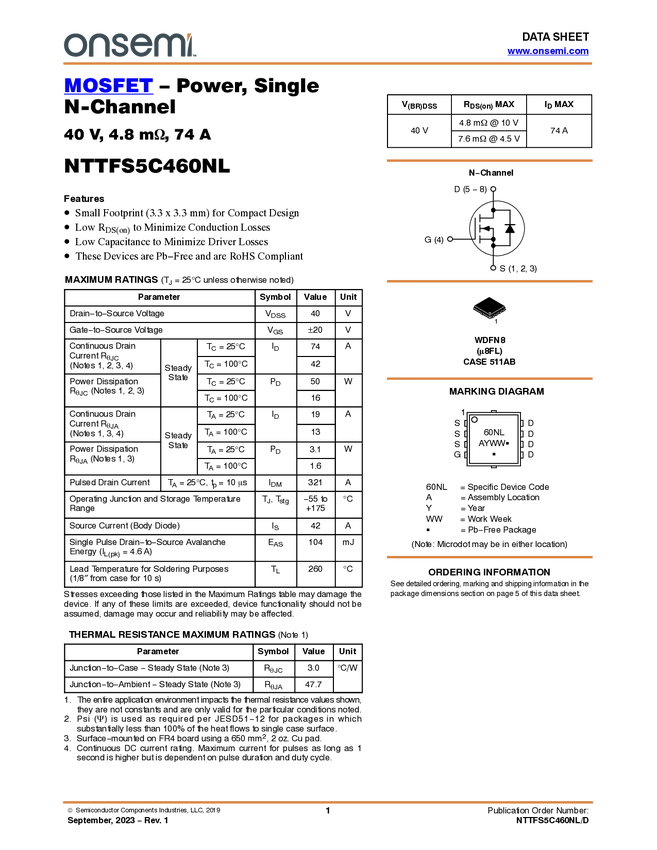 NTTFS5C460NL Single N-Channel Power MOSFET 40V, 74A, 4.8mΩ