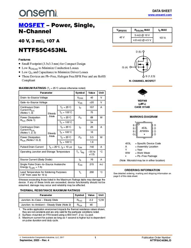 NTTFS5C453NL Single N-Channel Power MOSFET 40V, 107A, 3mΩ