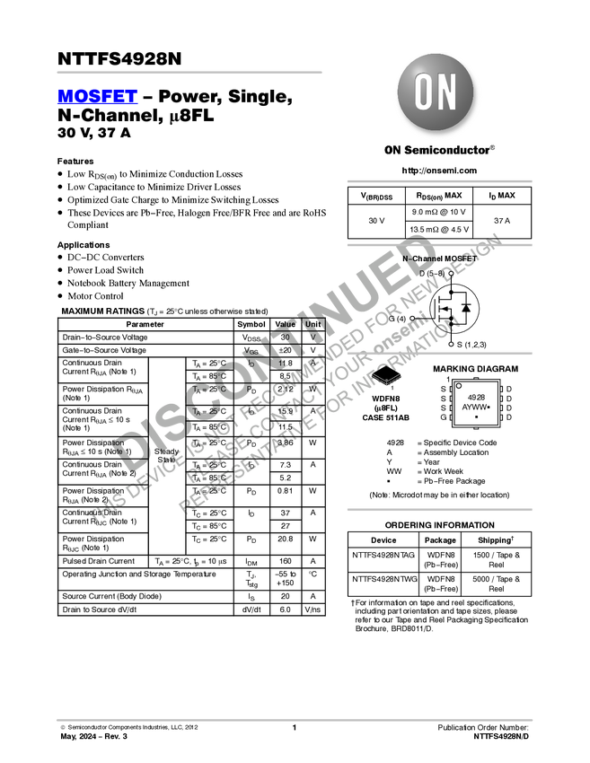 NTTFS4928N Single N-Channel Power MOSFET 30V, 37A, 9mΩ