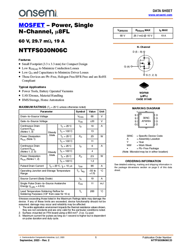 NTTFS030N06C Single N−Channel Power MOSFET 60V, 27A, 29.7mΩ in u8FL