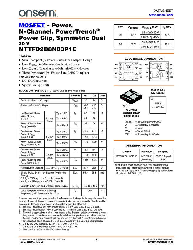 NTTFD2D8N03P1E MOSFET, Power, 30V POWERTRENCH® Power Clip