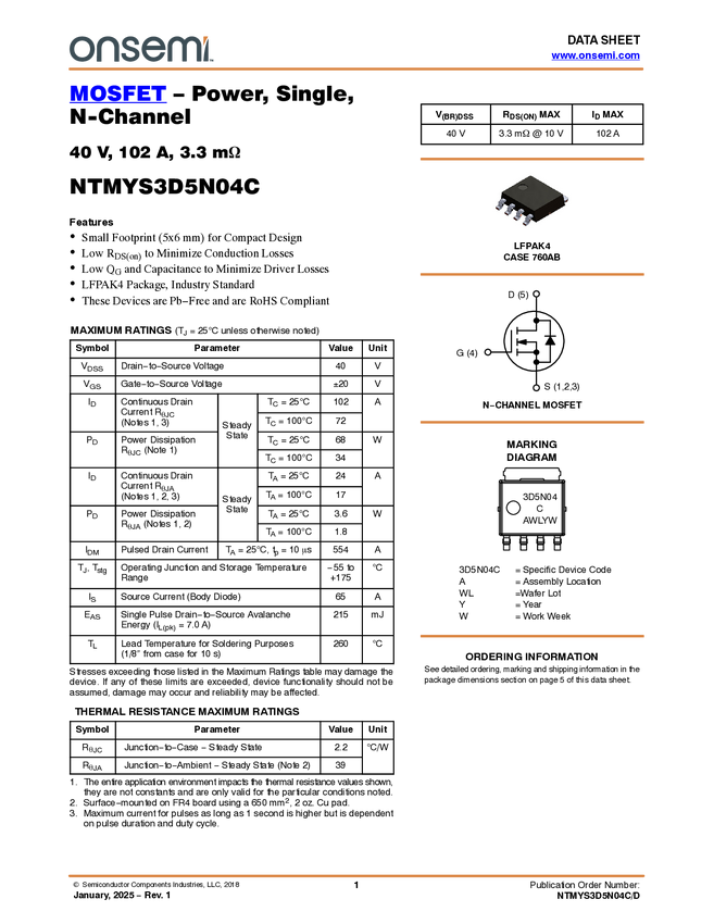 NTMYS3D5N04C Power MOSFET 40 V, 3.3Ω, 102 A, Single N-Channel