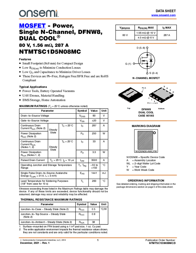 NTMTSC1D5N08MC MOSFET - Power, Single N-Channel, DFNW8, DUAL COOL<sup>®80 V, 1.56 mΩ, 287...