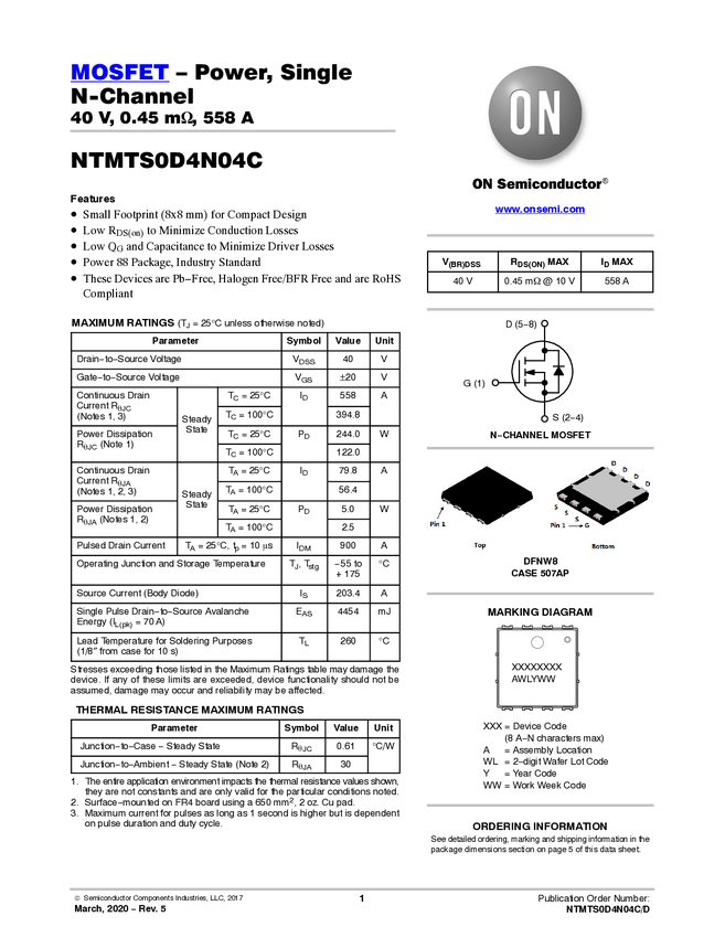 NTMTS0D4N04C Single N-Channel Power MOSFET 40V, 558A, 0.45mΩ, PQFN 8x8