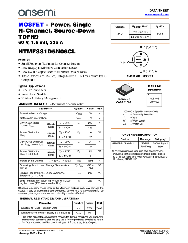 NTMFSS1D5N06CL MOSFET, Power, Single, N-Channel, Source-Down, TDFN9,  60V, 1.5mΩ, 235A