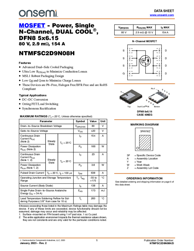 MOSFET - Power, Single, N-Channel, DUAL COOLTM, DFN8 5x6. 15, 80V, 2.9m, 154A