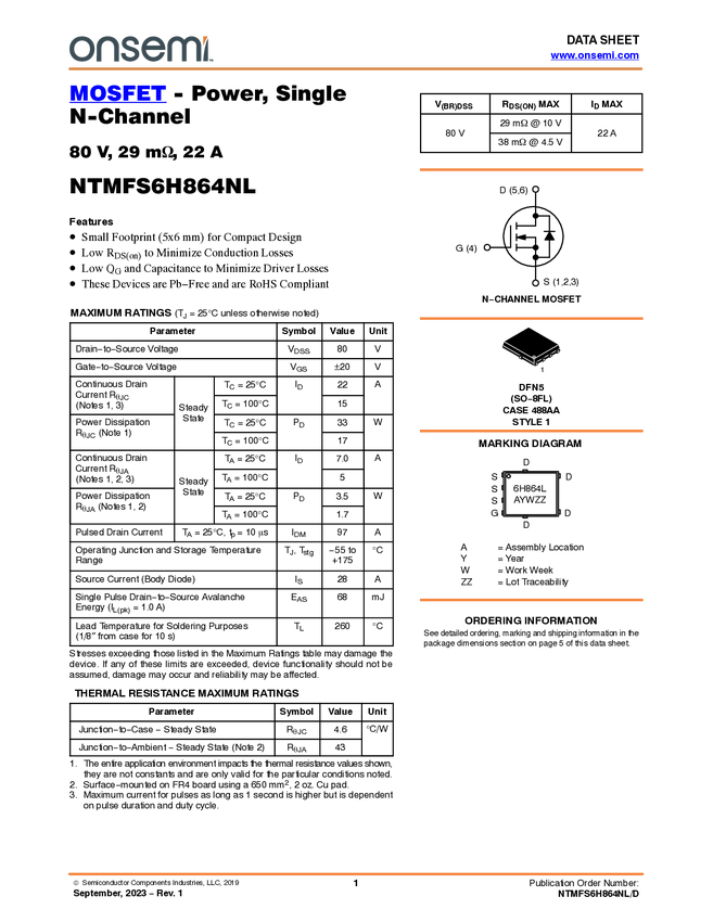 NTMFS6H864NL MOSFET - Power, Single, N-Channel, 80 V, 29mΩ 22 A - NTMFS6H864NL