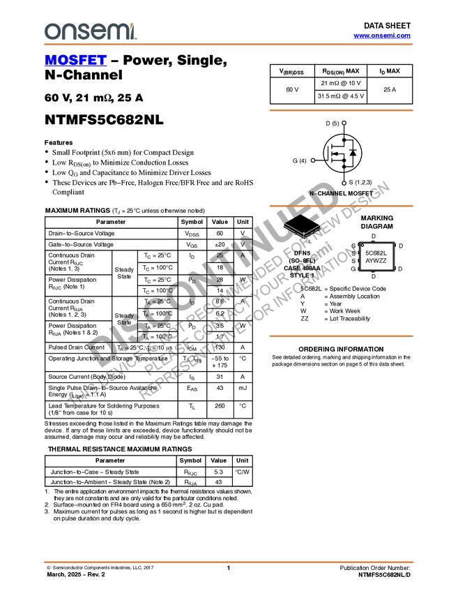 NTMFS5C682NL Single N-Channel Power MOSFET 60V, 26A, 21mΩ