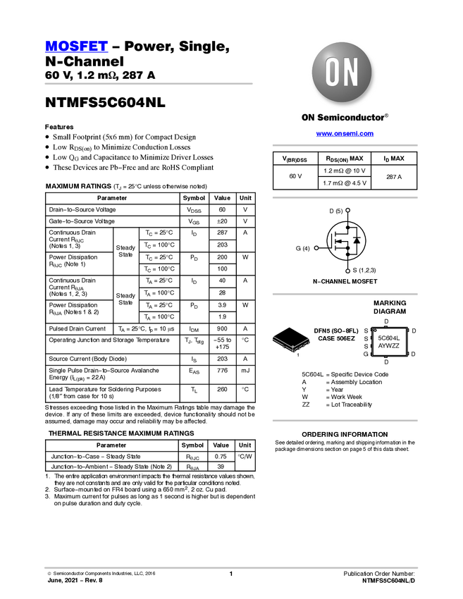 NTMFS5C604NL Single N−Channel Power MOSFET 60V, 272A, 1.2 mΩ