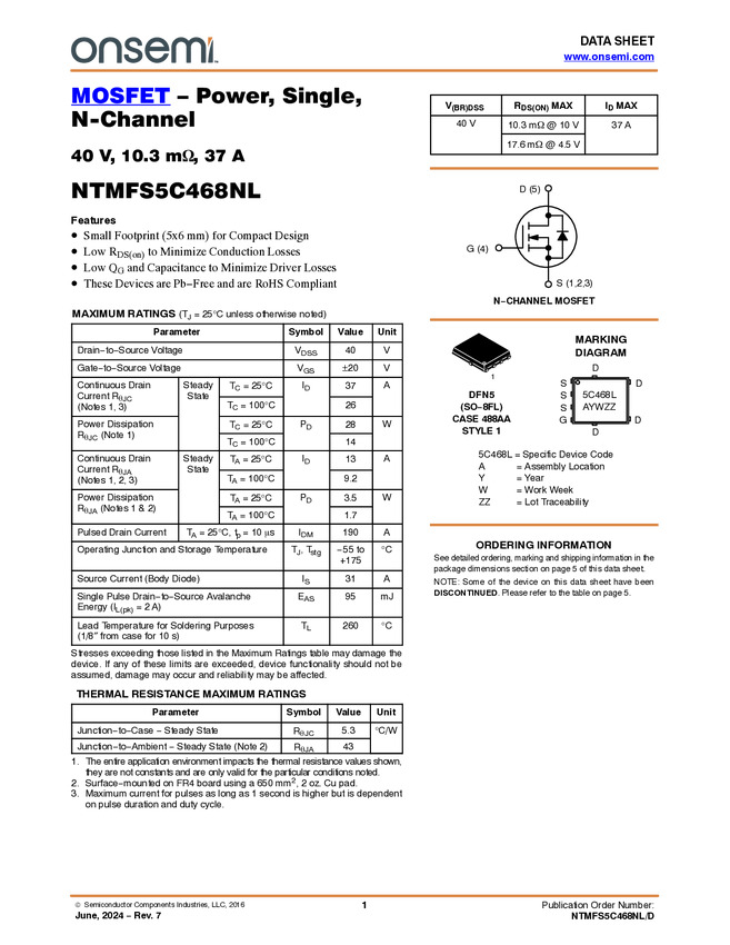 NTMFS5C468NL Single N-Channel Power MOSFET 40V, 37A, 10.3mΩ