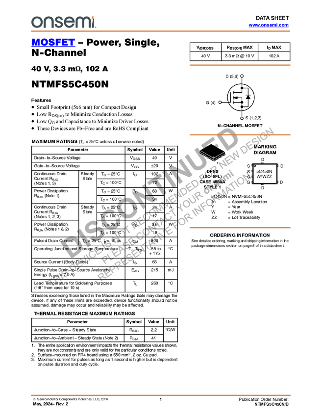 NTMFS5C450N Single N-Channel Power MOSFET 40V, 102A, 3.3mΩ