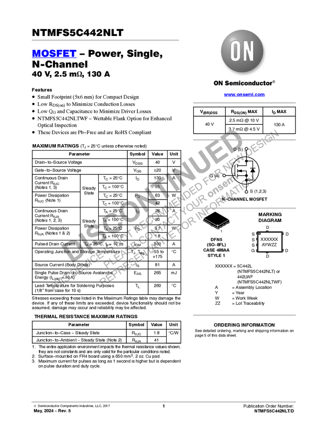 NTMFS5C442NLT Single N-Channel Power MOSFET 40V, 130A, 2.5mΩ