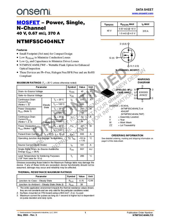 NTMFS5C404NLT Single N−Channel Power MOSFET 40V, 370A, 0.67mΩ