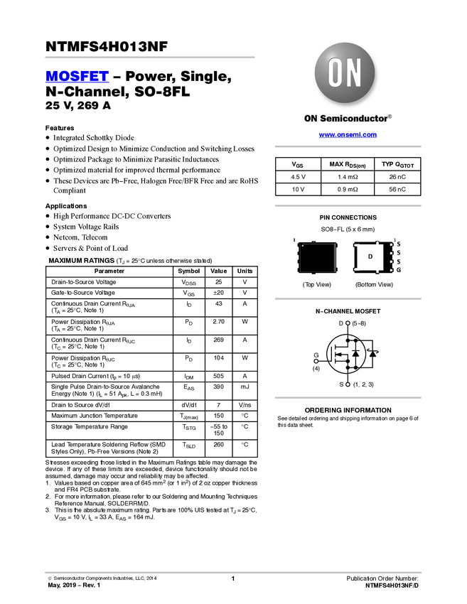 NTMFS4H013NF Single N−Channel Power MOSFET 25V, 269A, 0.9mΩ
