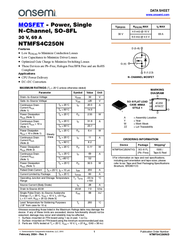 NTMFS4C250N Single N−Channel Power MOSFET 30V, 69A, 4.0mΩ