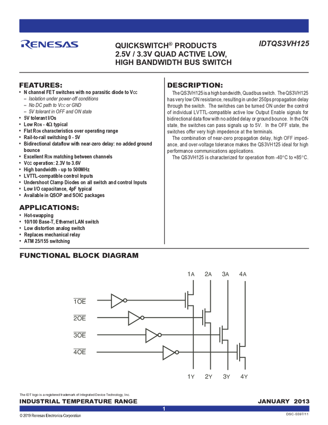 QS3VH125S1G QuickSwitch 3.3V Quad Active Low Switch for Hot Swap Applications